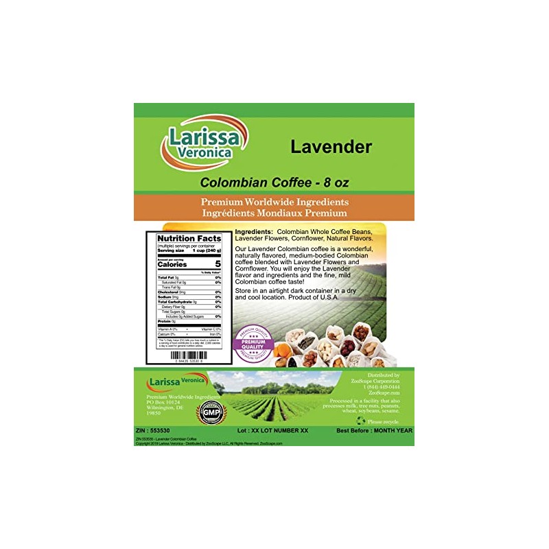 - Our Lavender Colombian coffee is a wonderful, naturally flavored, medium-bodied Colombian coffee blended with Lavender Flowers and Cornflower. You will enjoy the Lavender flavor and ingredients and the fine, mild Colombian coffee taste! - Ingredients: Colombian coffee (whole coffee beans), Lavender Flowers, Cornflower and Natural Lavender Flavor.