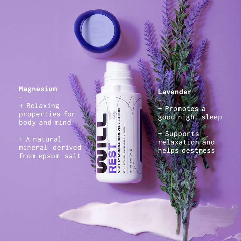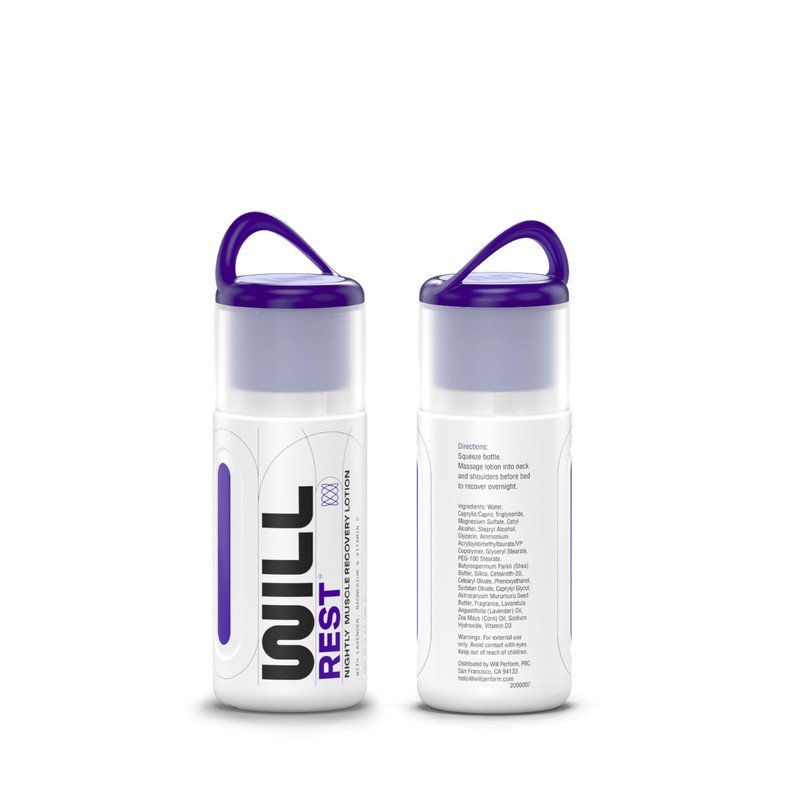 Recovery is sacred and sleep is a critical aspect of performance. WILL Rest Nightly Muscle Recovery Lotion gives your muscles and mind the rest and relaxation they need overnight, so you can stay active and keep performing. Formulated with a serene blend of Lavender and Geranium to support your best sleep and fused with Epsom Salts for recovery, our aromatherapy-inspired formula offers a soothing nightly recovery blend for athletes everywhere. Designed with a custom angled applicator for a targeted and hands-free massage application, our rich and absorbent lotion encourages a steady recovery that will rest your body and benefit your everyday performance. Our TSA-friendly size allows you to make good, recovery-focused sleep possible wherever you go...because who knows when you'll need some. Because recovery is a multi-step process, we designed a full lineup for both pain relief and daily muscle care.