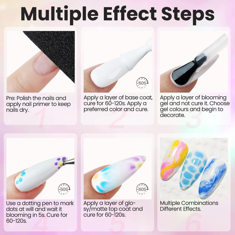 - 3. Blooming Gel for Stunning Nail Art - Effortlessly create ombre, marble and watercolor effects with this self-leveling blooming gel. Works with all gel polish colors to achieve salon-quality designs at home - no special skills required!