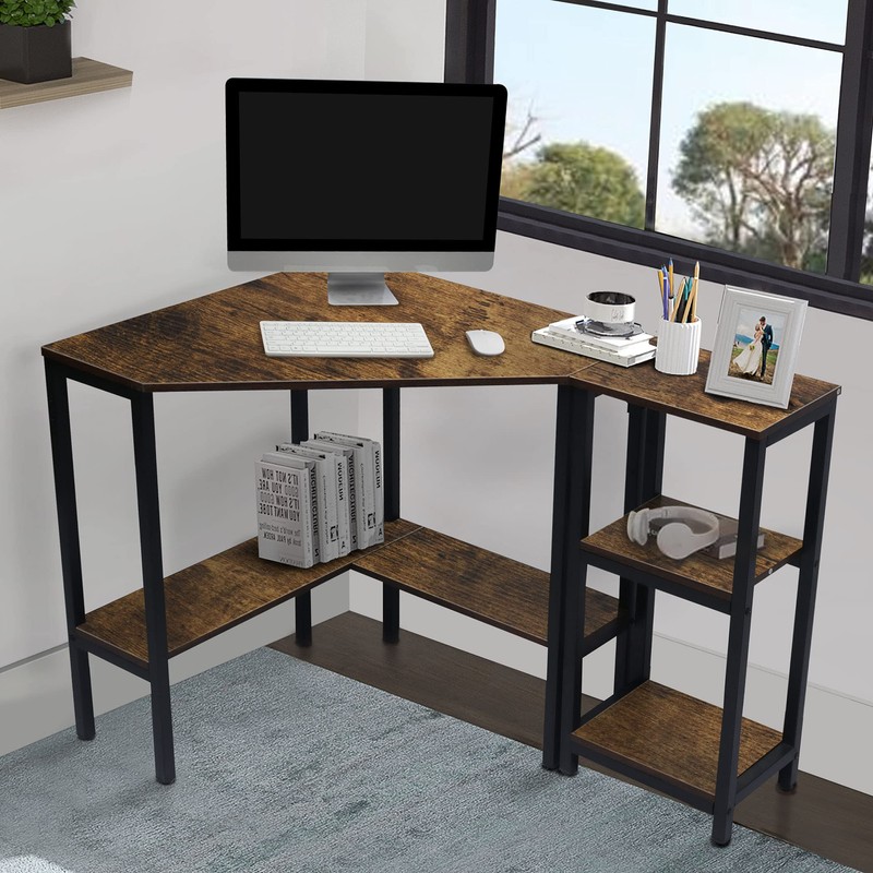 LAVIEVERT Corner Desk, Triangle Computer Desk with Storage Shelves, Laptop PC Table Writing Study Table Workstation for Home & Office - Rustic Brown