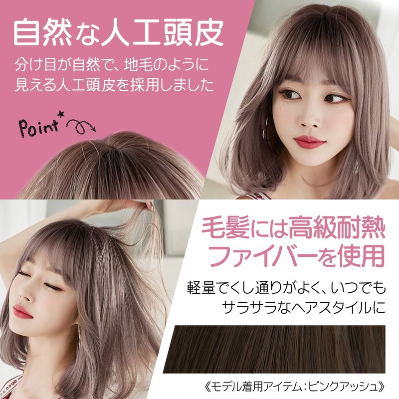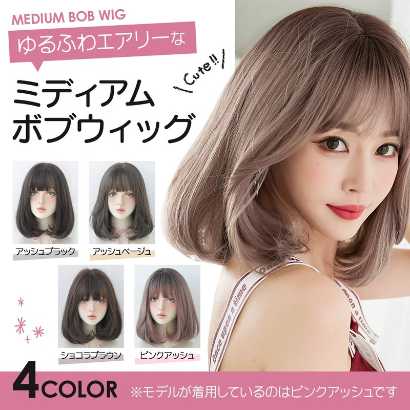 LAVIST Medium Bob Wig, Women's, Semi-Long, Full Wig, Women's Wig, Natural, Small Face Effect, Net Included (Pink Ash)