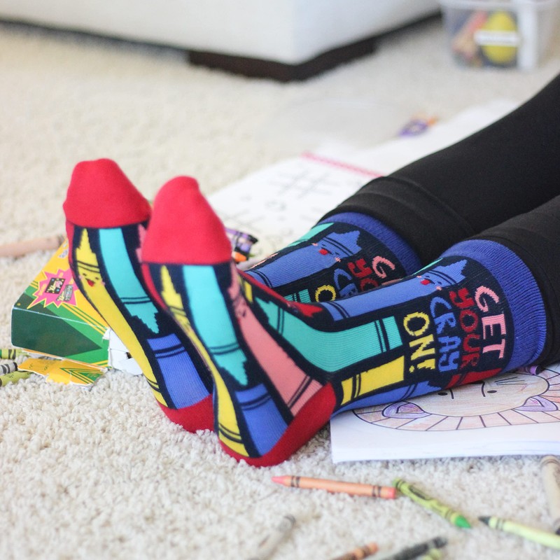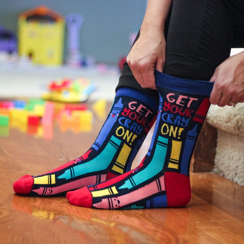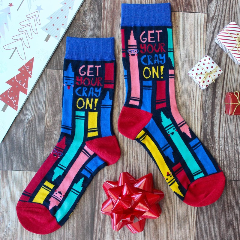 - GET YOUR CRAY ON SOCKS: Teachers, students and parents alike will get a kick out of these funny socks. Featuring colorful crayons and a hilarious saying, these bold socks are the perfect gift for teachers, moms and anyone who loves coloring!