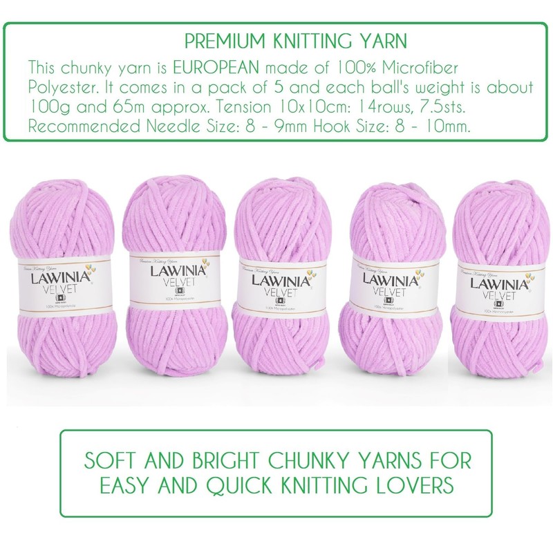 - Premium Chenille Wool for Crochet (ORCHID): This chunky yarn is made of 100% microfiber polyester. It comes in a pack of 5 and each ball weighs approx. 100 g and 65 m. Tension sample 10 x 10 cm, 14 rows 7.5 stitches, recommended needle size: 8 - 9 mm, hook size: 8 - 10 mm.