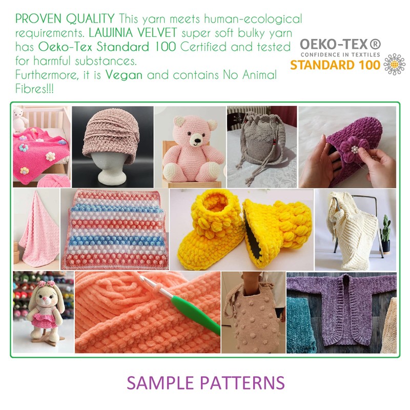 - Proven quality – this Hobbii wool meets human ecological requirements. The super soft, plush wool from LAWINIA Velvet is Oeko-Tex Standard 100 certified and tested for harmful substances. In addition, LAWINIA chenille yarn it vegan and contains no animal fibres. !