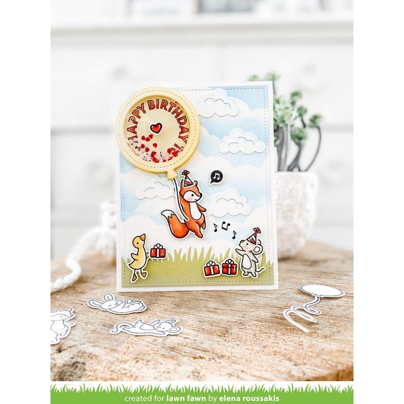 - Lawn Fawn Really High Five 4”x6” Clear Stamp Set - approximate sizes: small balloon: 3/4" x 5/8", large balloon: 1" x 1", fox: 1 1/4" x 1 5/8", bear: 1 3/4" x 1", bunny: 1 1/2" x 3/4", mouse: 5/8" x 1 3/8", trampoline: 1 1/2" x 5/8"