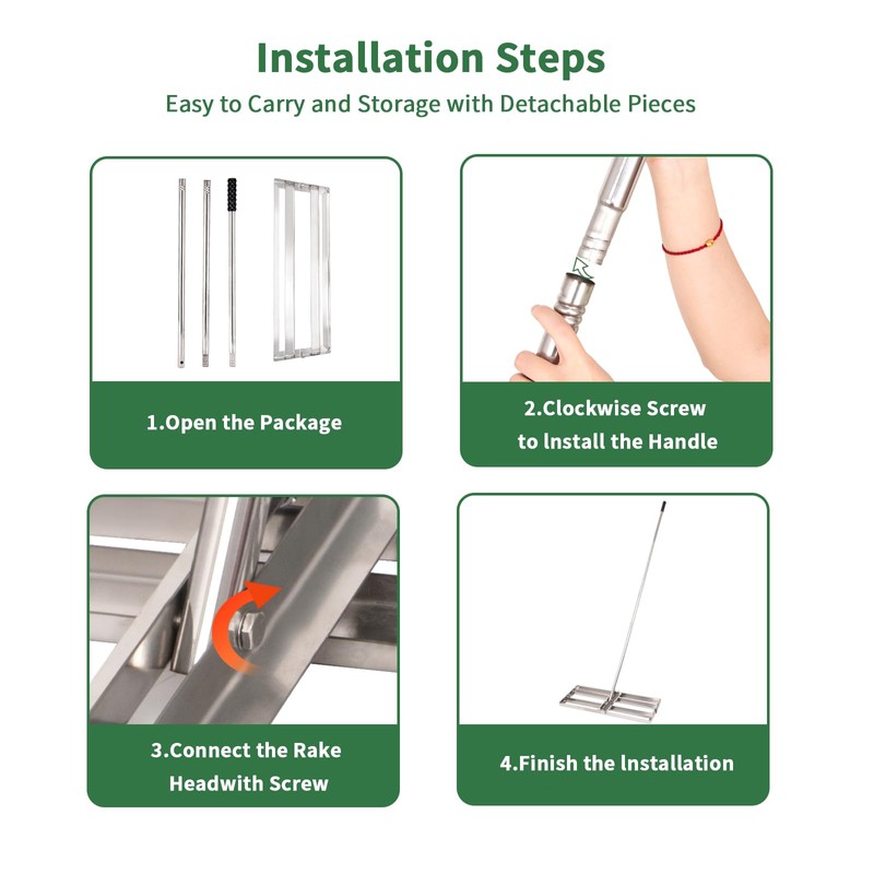 - Heavy-Duty Construction: Made with 1/5" thick stainless steel and reinforced welds, this Lawn Leveling Rake is designed to handle tough jobs. The rust-resistant coating ensures long-lasting durability, making the Stainless Steel Lawn Leveler great even in tough outdoor conditions