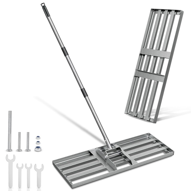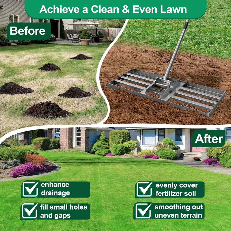 - Versatile Use: Perfect for leveling soil, compost, mulch, gravel, and fertilizer, this leveling rake is a must-have for gardens, farms, golf courses, soccer fields, and backyards. Whether you're working on Kentucky bluegrass, Bermuda, or ryegrass, it helps achieve a smooth and even lawn surface without the need for additional bulky tools