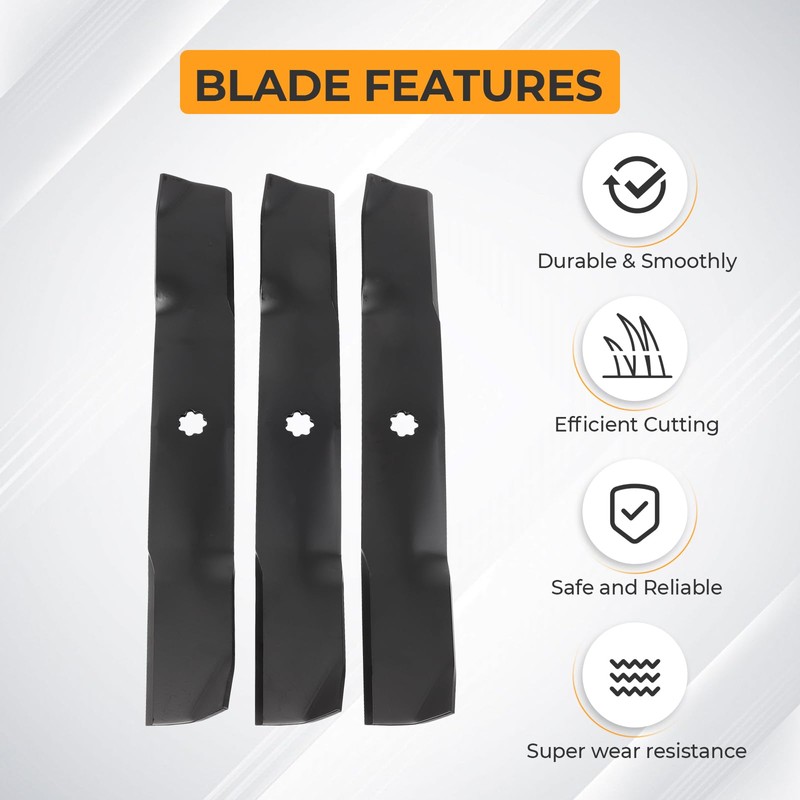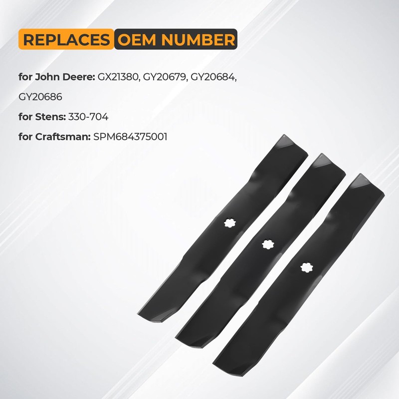Replace for Part Numbers: GX21380, GY20679, GY20684, GY20686, 330-704.Compatible with: G110, 190C, LA150, LA175, D170, E180, S180 with 54" mower deck.Specifications: Blades Length: 18 5/8", Blades Width: 2 3/4", Blades Thickness: 0.197", 7 Points Star Center Hole (Please wear gloves for safety during installation.)Excellent Material: The blades are made of high-quality steel and are durable. The sharp blades cut the grass cleanly and cut through the lawn efficiently.Attentton: Please check the OEM Part Number and model we listed in the description to confirm compatibility before purchasi, incompatibility after purchase, or other questions, please send an email and we will reply as soon as possible.