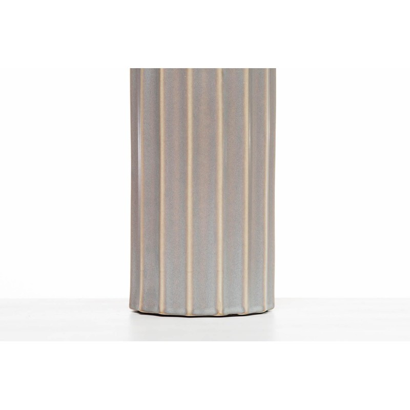 The refined Naomi lamp with gentle vertical ridges provides warm light for writing desks and end tables. Smooth finishes in porcelain convey sophistication for this versatile piece. Height: 25" Base Height: 14" Base Width: 6.5" Shade Dimensions: 15" T x 15" B x 9" H Shade Material: Textured Linen Wattage: 60 W Socket: Standard E26 UL-Listed Exact Color Support: Benjamin Moore "Hearthstone" 1601, Behr "Cool Ashes" N520-4