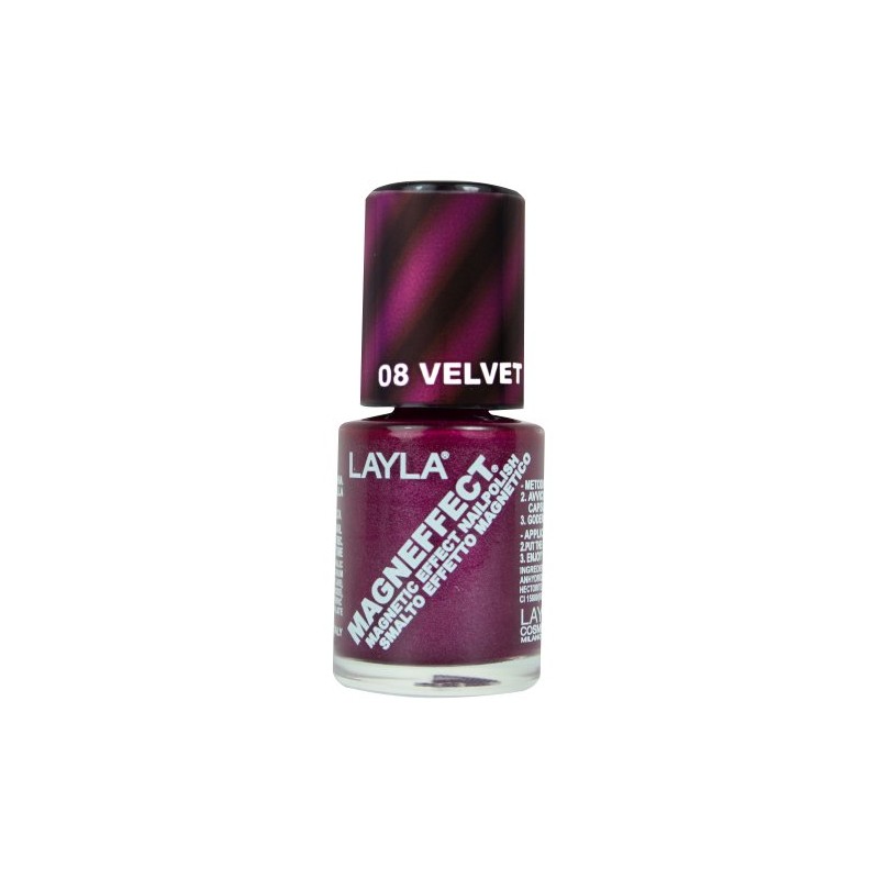 Layla magneffect nail polish is a revolutionary blend formulated to react to the magnet on the cap of the bottle creating instant, tridimensional designs in seconds. Simply apply a coat of magneffect, flip over the cap with the magnet and hold over nail as close as possible without touching the nail for 10 seconds. See the design appear right before your eyes. Apply a second coat and repeat steps for a more intense design. If you touch the nail with the cap just add another coat of polish and flip cap again as before. Have fun with it. Change the design by changing the direction of the marked line. No base coat is needed prior to applying magneffect. Apply directly on clean nail. Can be used on acrylic and restructured nails. Quick drying. High gloss finish. Easily removed with nail polish remover. Free of formaldehyde, toluene, DBP. Made in Italy.