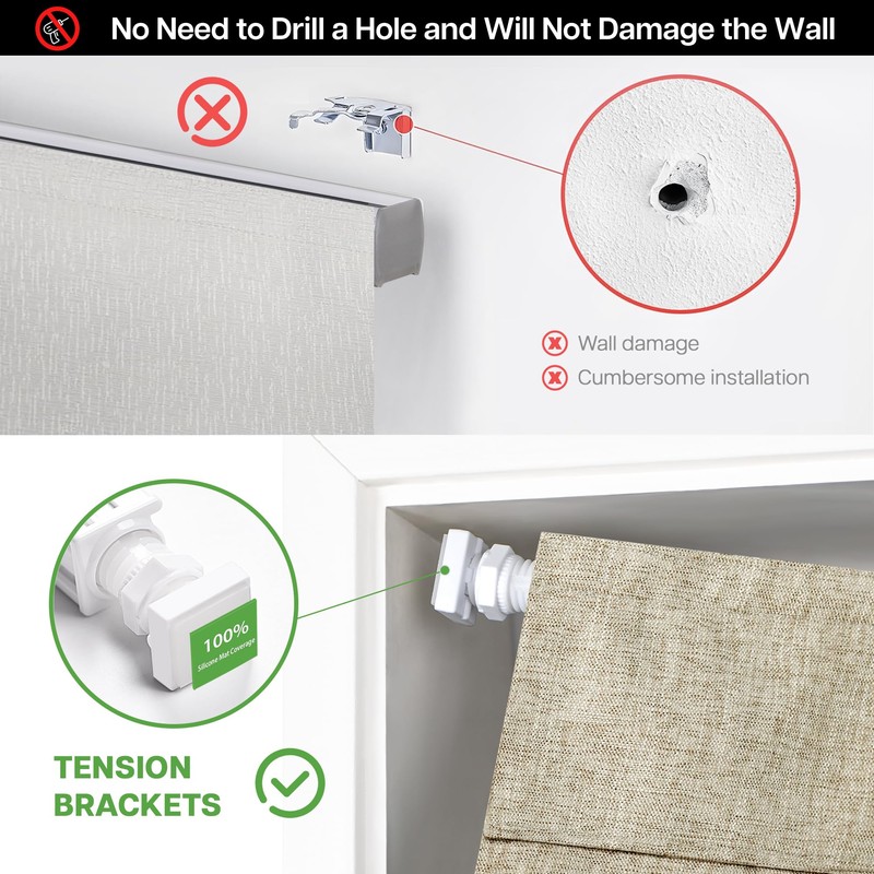 - No Drill Blinds: LazBlinds patented technology No Tools-No Drill system allow it no need to drill any holes on your window frame, great for Renter, Landlord, and Home Buyer. Easy to Install in 30 seconds with no tools-no drill, screws, or brackets. And it can afford maximum 30kg. Fit All Kinds of Walls, like woodiness metope, tile marble, concrete wall and rough tile.