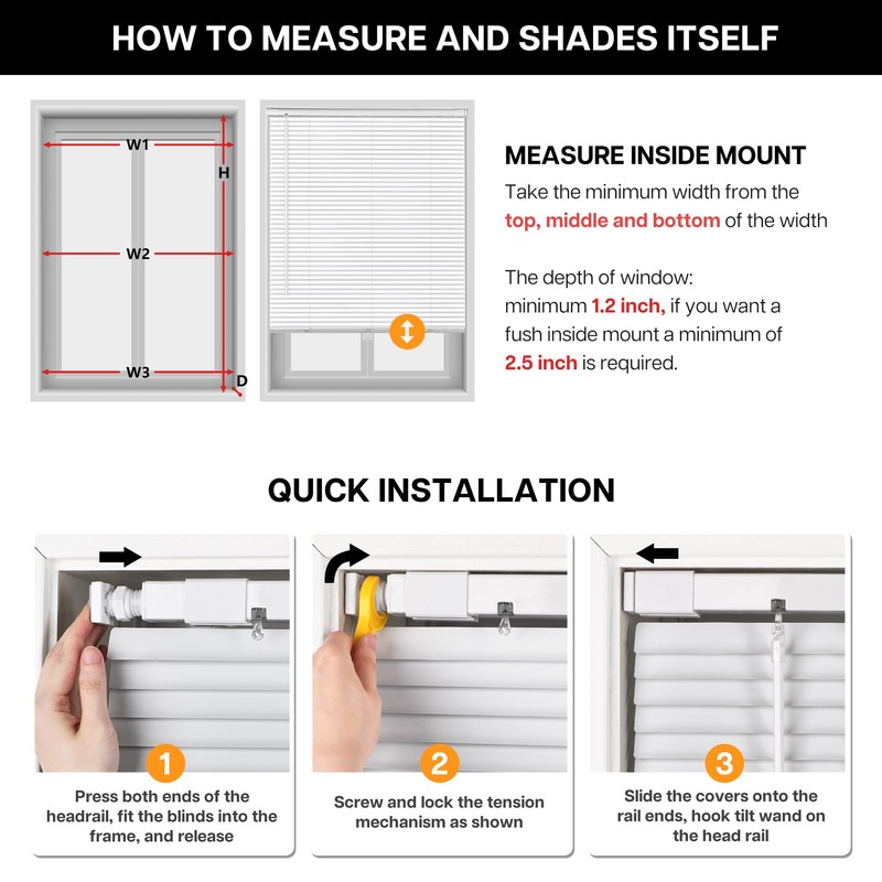 - No Drill Blinds: LazBlinds patented technology No Tools-No Drill system allow it no need to drill any holes on your window frame. Perfect for Renter, Landlord, and Home Buyer. Easy to Install in 30 seconds without screws or brackets. Fit All Kinds of Walls, like woodiness metope, tile marble, concrete wall and rough tile.