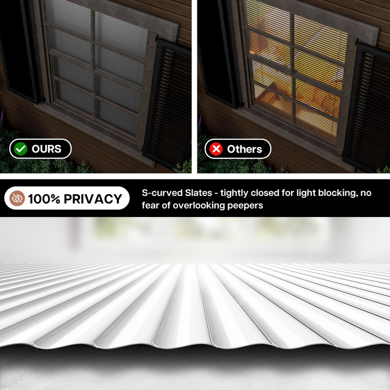 - Privacy Blinds for Windows: Premium dense S-curve slats with invisble hole design can completely keep out the sunlight and uv ray, offering a real dark environment. At the same time it is possible to use the twisting wand to switch between light filtering or room darkening. Perfect for living room, family room, bedroom, bathroom.