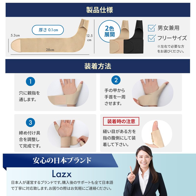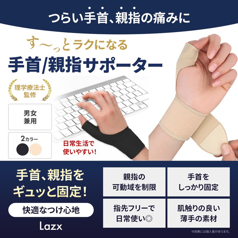 【理学療法士監修】日本ブランドのLazx(ラズクス)がお届けする「す~っとラクになる!手首/親指サポーター」 腱鞘炎、バネ指、関節症などの育児や家事、パソコン作業などで起こる親指、親指付け根、手首の痛みに対してお悩みではありませんか? 手首、親指をギュッと固定することで親指の可動域が制限され、手首もしっかり固定されるので負担のかかりやすい場所を強力サポートします! ※メンズ、レディース問わずご使用いただけます。