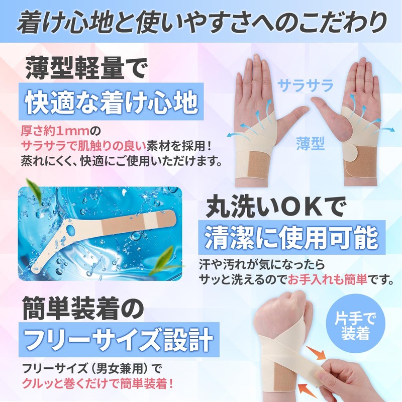 - 【快適なつけ心地】肌触りの良い 薄手 の素材なので、抜群のフィット感で日常生活はもちろん スポーツ 時、長時間の使用でも快適なつけ心地で1年を通してご使用いただける 手首 サポーター です。