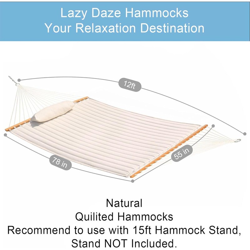 Lazy Daze Hammocks 12 FT Double Quilted Fabric Hammock with Spreader Bars and Detachable Pillow, 2 Person Hammock for Outdoor Patio Backyard Poolside, 450 LBS Weight Capacity, Natural