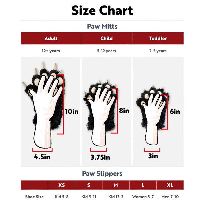 - ADULT AND KID SIZES: Our sets are available in sizes X-Small to X-Large. The best part is that these cute accessories can be used for more than just one night. Your boy or girl can wear these during the winter or quickly transform into their favorite furry animals anytime! And why should the kids have all of the fun? Our booties and gloves are available in adult sizes, so you can get sets for the whole family.