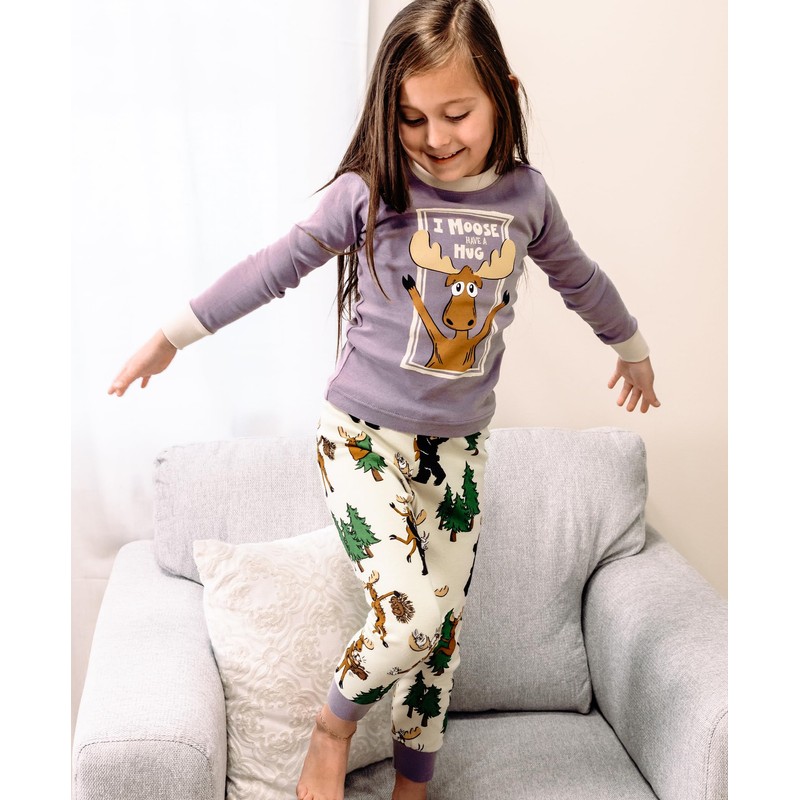 Lazy One Warm Long-Sleeve PJ Sets for Girls and Boys, Funny Animal Kids' Pajama Sets, Cozy, Comfy (Moose Hug Purple, 8)