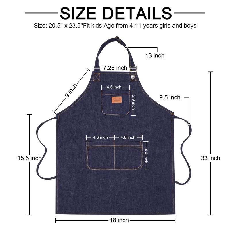 - LAZYNICE Kids Apron Size: 20.5'' x 23.5''(Age 4-11 years) adjustable neck strap: 13 inch, ONE SIZE FITS MOST: The apron measure 18" Width (Tie 33cm, 13inch) x 33" Long (with suspender length 24CM, 9.5inch), with extra-long strap to warp around neck and waist.