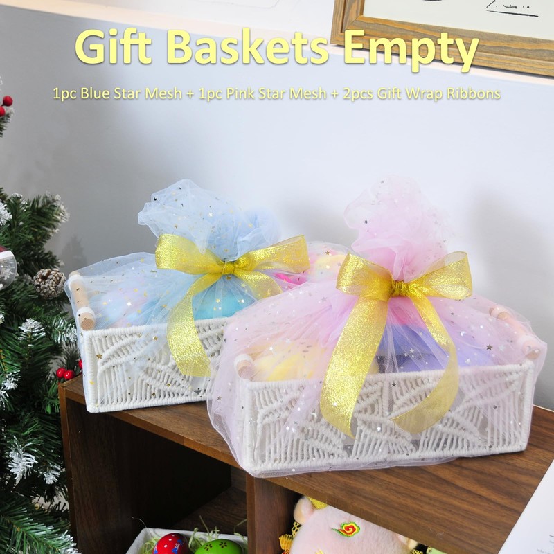 - Decorative Gift Baskets Empty - Color box packaging, come with 1pc blue mesh, 1pc pink mesh and 1 gift wrap ribbons (2m/6.56ft, you can cut the length as needed). A great ideal gift basket for Valentine's Day, Easter Eggs, Women's Day, St. Patrick's Day, Mother's Day, Father's Day, Halloween, Thanksgiving, Christmas, New Year's, birthdays, anniversaries, etc.