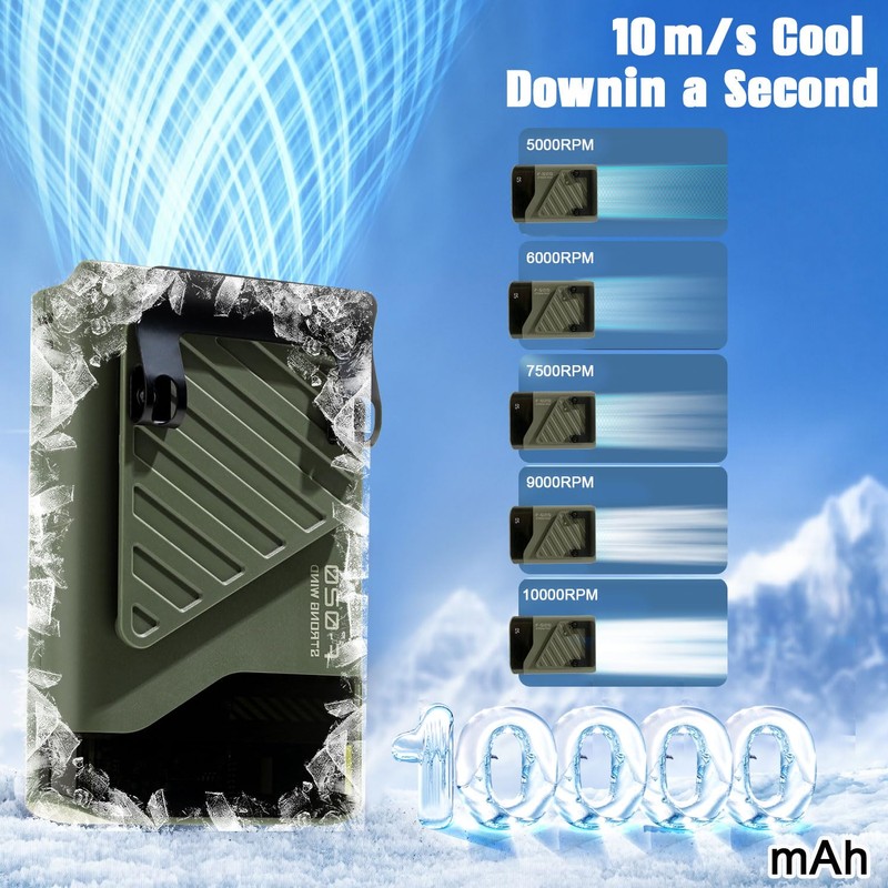 - Adjustable & Versatile Use –Choose from 5 speeds (16.5ft/s to 33ft/s) with a 10,000 RPM turbine—50% more efficient than standard fans. The LED screen displays real-time battery level (0-100%) and speed. Ideal as a portable fan for cruise trips or a quiet fan for sleeping.