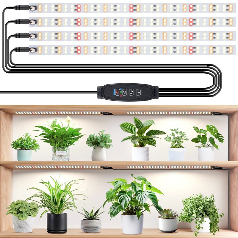 - 【Two Installation Methods】Provide zip ties and double-sides tapes, so you can install lights with zip ties or double-sides tapes on your shelf.【Package Content】1 Pack: grow light stripx4;adapterx1;timerx1;zip tiex8;doule-sided tapex8 (size of one light strip is 13"x0.63")