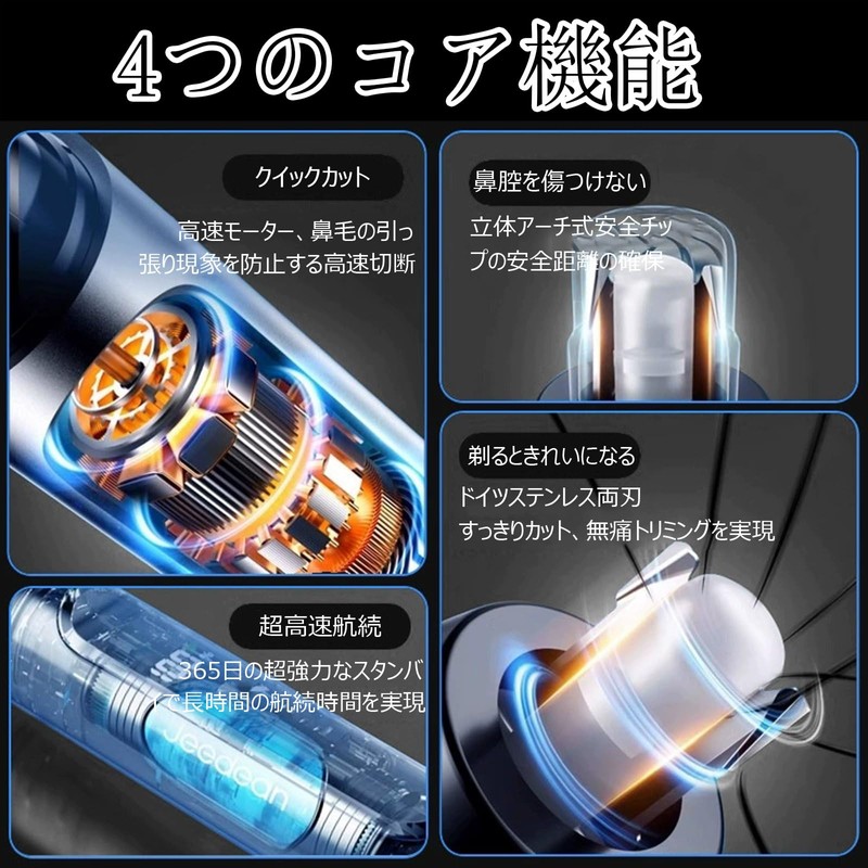 【デュアルブレードデザイン】デュアルエッジ刃を採用するので、側面からの毛だけではなく、上から入る毛もカットできます。また、人間工学に考えれた立体的な弧線デザインで鼻腔の肌に優しくて安心できます。安全性が高く、無駄毛を素早くカットでき、鼻腔にもびったりとフィットし、奥まできれいにカットできます。