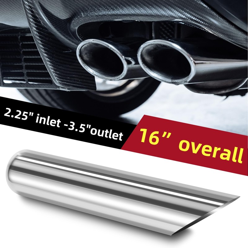 - SIZE: Standard exhaust tip size 2.25" inlet 3.5" outlet 16" overall length,please measure the OD of your tailpipe before purchasing
