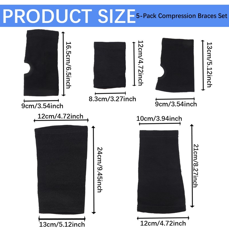 - 【Full-Body Joint Support】This 5-piece compression braces set includes ankle, knee, wrist, elbow, and palm sleeves, providing targeted support for sprains, arthritis, and tendonitis. Ideal for athletes, fitness enthusiasts, and injury recovery.