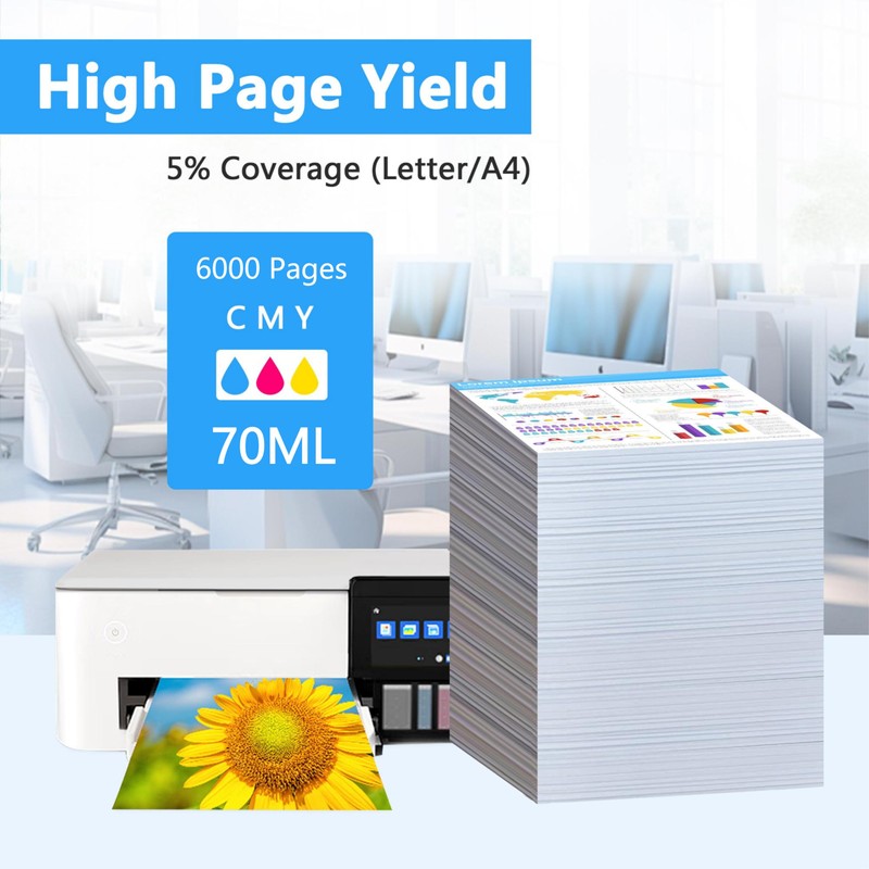 - High capacity: ink bottle with extra large capacity, longer replacement interval. Contains 3 ink bottles: up to 6000 pages per cyan/magenta/yellow ink bottle in 70ml (at 5% coverage of A4 paper).