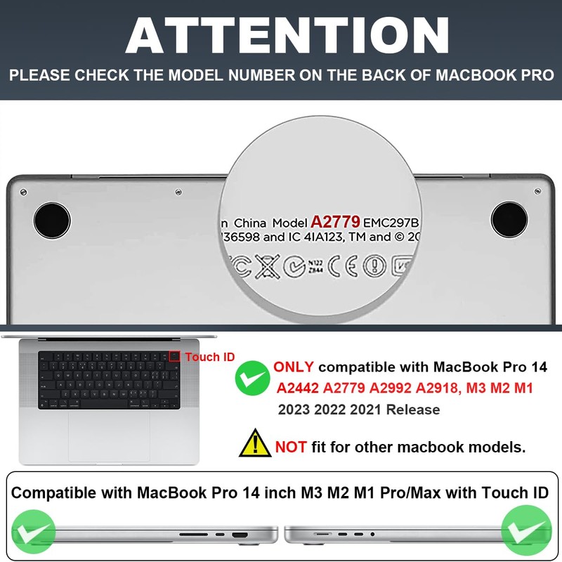 - Compatible with MacBook Pro 14 inch 2024 2023 2022 2021 M4 M3 M2 M1 Pro / M4 M3 M2 M1 Max Chip with Touch ID, Model A3112 A3185 A3401 A2918 A2992 A2442 A2779. NOTE: not fit for other model laptops.