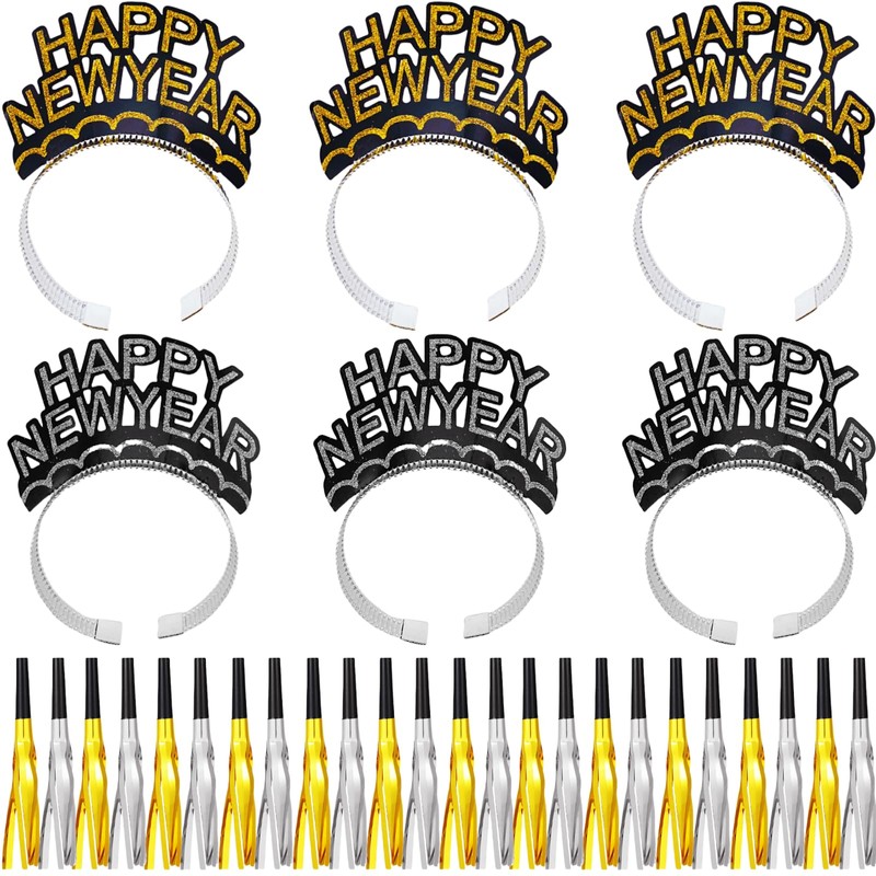 - Festive Party Essentials: This 30-piece set includes 6 Happy New Year headbands and 24 metallic fringed noise makers in gold and silver colors.