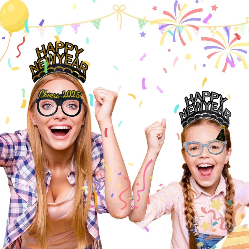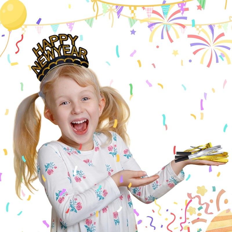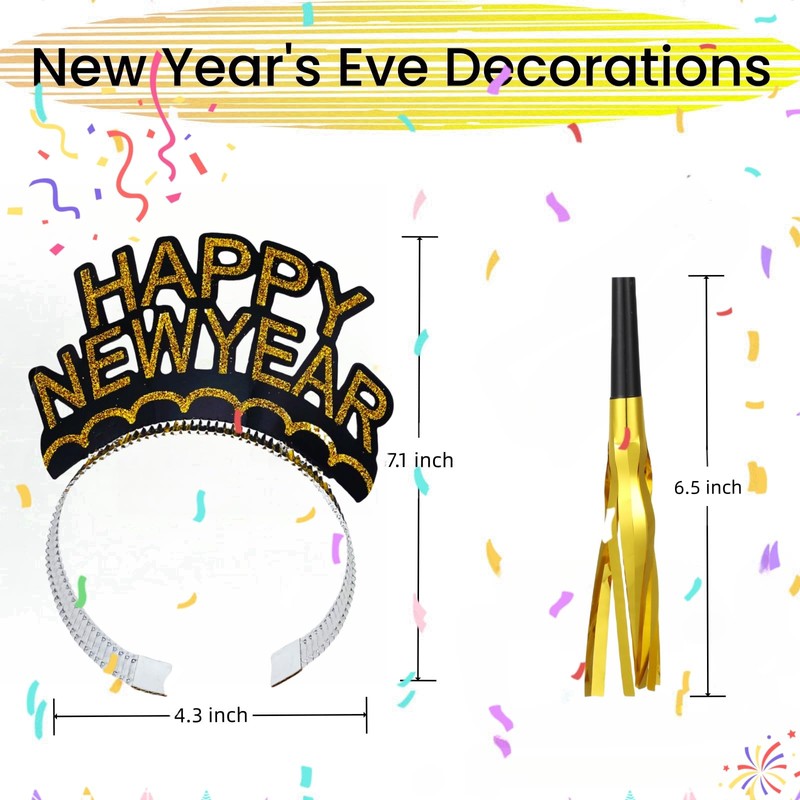 - Vibrant Headbands: Liven up the celebration with 6 colorful headbands featuring the phrase 'Happy New Year' in eye-catching designs.
