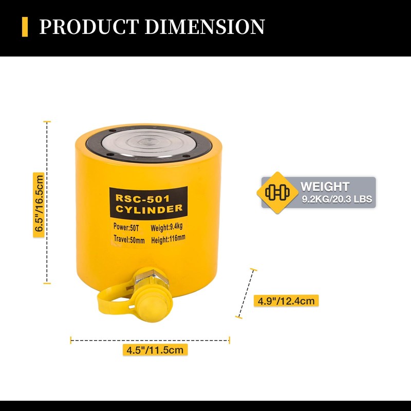 - π¨γπππ πππππ ππππγ[Model]: RSC-501; [Capacity]:50T/110231 LBS; [Storke]: 50mm/2inch; [Outside Diameter]: 124mm/4.88inch; [Inner Diameter]: 98mm/3.86inch; [Oil Storage]: 376cmΒ³; [Effective area]:75.3cmΒ².