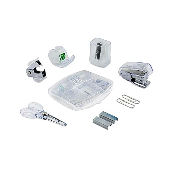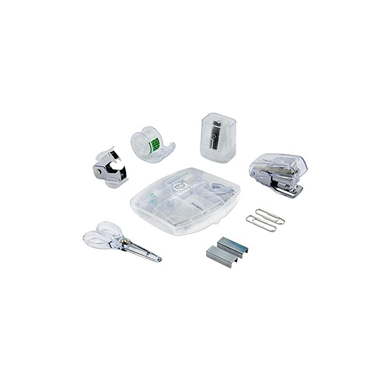 LD Clear Mini Office Supply Kit Portable Case with Scissors, Paper Clips, Tape Dispenser, Pencil Sharpener, Stapler & Staple Remover