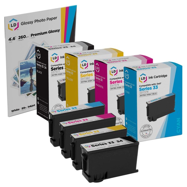 - Included: 1 T9FKK 331-7377 Black | 1 8DNKH 331-7378 Cyan | 1 6M6FG 331-7379 Magenta | 1 GRW63 331-7380 Yellow | Complimentary 4X6 Premium Glossy Photo Paper