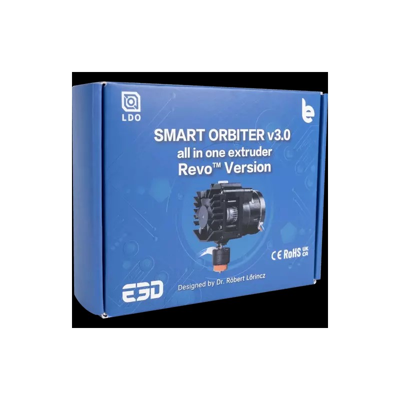 From the Orbiter Project: Smart Orbiter v3.0 is a brand new innovative all in one dual drive extruder. The main mission of this design is the integration o the well proven Orbiter v2 concept into a lightweight all in one smart extruder. Why smart? This is the first extruder with integrated electronics. Together with Klipper, it is an awesome combination I guarantee! 1. Features And Performance This brand new all in one extruder design with many cool features we call Smart Orbiter v3.0 is one of my latest and finest extruder design made in collaboration with LDO Motors. The extrusion system concept and mechanical performances are similar to the Orbiter v2.0 but completely redesigned from ground up. Summary of the coolest features Pure plated copper heat-block with 72W ceramic heater and Bondtech CHT nozzle for highest possible weight VS flow ratio; Heat-break performance optimized with finite elements analysis for extreme temperature gradient to ensure clogless free printing experience; Unique tensioning mechanism with elastic predefined tension levels Frameless recessed fan to reduce the extruder weight and outside dimension Large RNC coated dual drive gears with planetary gear reduction, similar to orbiter v2.0 New precision main shaft design to reduce gear eccentricity Full aluminum housing with Delrin plastic gears for low noise and long lifetime The smart feature – integrated electronics Easy remove system of the secondary drive gear for easy cleaning and maintenance Double filament exit guide system for best TPU printing performance Overall weight is 175g Some more information about this great all-in-one extruder/hot end: Heat-Block New 72W ceramic heater with Bondtech CHT nozzle for highest flow/weight ratio. Very short distance between drive gears and heat-block (17.7mm) Screw mounted thermistor for best thermal contact (104NT-4-R025H42G - Optional PT1000) Easy and fast nozzle + heat-block swap – single screw release Bimetallic Heat-Break Heat-break made out of stainless steel tube with 0.25 mm wall thickness for lowest heat transfer. M7 heat-block mounting screw - compatible with V6 heat-block styles Bi-metallic heat-break together with the heatsink optimized for highest temperature gradient using finite element analysis. Wire Strain Release Stainless steel wire strain release feature to avoid wire brake issues of the heater and thermistor wires. Shape optimized for bad thermal transfer to reduce thermal losses. Quick Nozzle Change Quick nozzle change optimized for best thermal performance implies a simple swapping of the heat-block retained by one single screw. Heater and thermistor wires connected via microfit connectors for easy electrical disconnection. High Flow Best optimized weight vs flow ratio thanks to Bondtech CHT nozzle, flow rate 35-40 mm3. Note: Actual flow depends on the filament type, nozzle temperature and size. The picture exemplifies a typical behavior measured using SUNLU PLA @ 210°C. The figure shows performance results using standard V6 plated copper nozzle, Bondtech CHT 0.4mm and 0.6mm. Double Filament Guide For good TPU printing experience its important that there is no gap left between the drive gears and exit guide where the filament could escape. The two guarding features, center and side leads to no physical space where even the most flexible filament can escape. The center guide stops filament to be chewed in between the drive gear tooths. The side guides stops the filament to be chewed into the gap between the drive gears. Filament Tensioning Filament tensioning lever with three predefined positions: open, L1 (soft) and L2 (hard). No need to guess anymore the correct tensioning, the predefined positions ensure repeatable and always correct tensioning. The elastic tensioning arm makes sure the tensioning is independent from filament diameter and avoids filament deformation due to over-tensioning. Secondary Drive Gear Secondary drive gear easy remove feature for easy cleaning and maintenance. The secondary drive gear together with the tensioning arm can be removed simply by removing one M3 screw. Precision Mainshaft Redesigned octagonal shaped precision aluminum main shaft. The outer diameter of the shaft is slightly bigger than the inner diameter of the bearing and the main drive gear. The octagonal shape allows slight deformation of the aluminum shaft to match the exact inner diameter of the bearings and the drive gear, therefore reducing any eccentricity to a minimum. Integrated Electronics Integrated electronics, the smart features: Filament sensing and auto load Filament auto unload RGB LED lit filament input White LED hotend lit Extruder temperature sensor ESD and short circuit protection Optimized for Klipper Outside Dimensions Total weight of 175g. For more information see the Orbiter Project pageSmart Orbiter 3 REVO by LDO Motors All-in-one Extruder (SO3 V3)