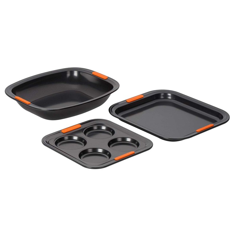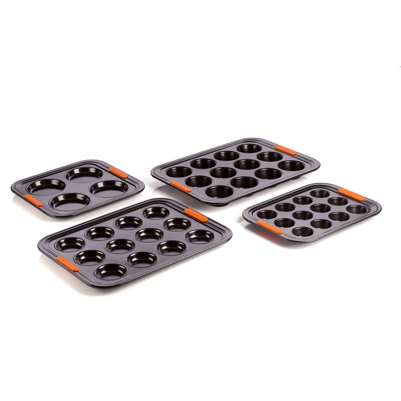 - Easy to use and clean: Non-stick coating, Easy food release, Rolled edge, Secure-hold silicone inserts for added grip, Easy handwash