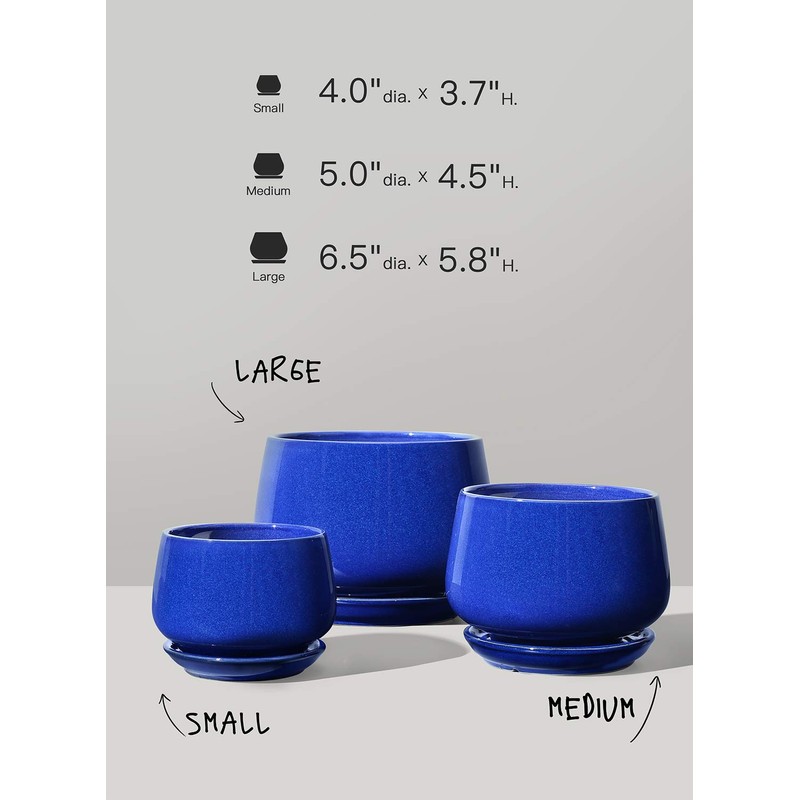 LE TAUCI Plant Pots with Drainage Holes and Saucers, 4.1" & 5.1" & 6.5" Ceramic Pots for Plants, Planters Indoor Plants - Small to Large Sized, Set of 3, Sapphire Blue