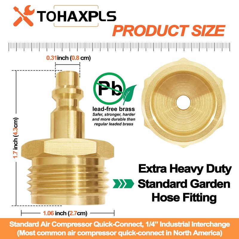 - Compatible with standard garden hose threading and air compressor quick-connects commonly used in North America. Features a 1/4" quick plug and 3/4" GHT (garden hose thread) male threading, ensuring a secure and hassle-free connection