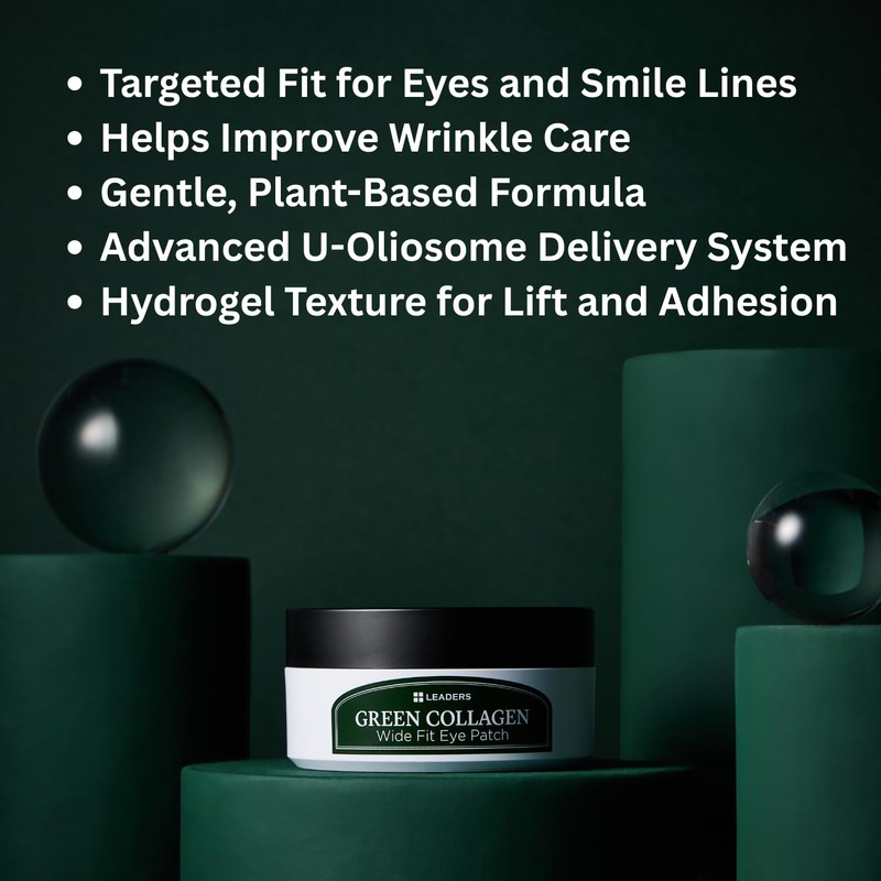 - GENEROUSLY SIZED WIDE FIT FOR TARGETED MULTI-AREA CARE: Designed to cover both the delicate eye area and nasolabial folds, the Leaders Green Collagen Wide Fit Eye Patch offers versatile, multi-functional care. Its large size ensures it adheres comfortably and effectively to problem areas prone to wrinkles, fine lines, and sagging skin. This wide fit allows the patch to deliver nutrients and hydration precisely where you need them most, making it an ideal solution for those seeking targeted firmness and wrinkle reduction in both the eyes and smile lines with one convenient step.