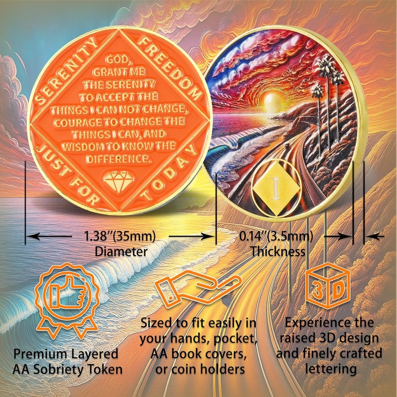 Leafence Sunset Beach Sobriety Coin Commemorative Coin Recovery Addiction NA AA Chips and Medallions with Inspirational Quote Narcotics Alcoholics Anonymous Gifts (Sunset Beach Road, 1 Year)