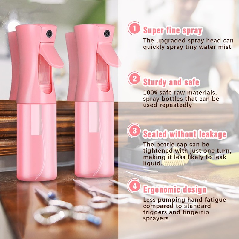 - Excellent Feeling of Use The upgraded high-pressure nozzle has a finer spray, a more comprehensive angle, and a more uniform spray. The fine mist spray bottles can easily spray a light mist of water to keep hair moist without dripping.