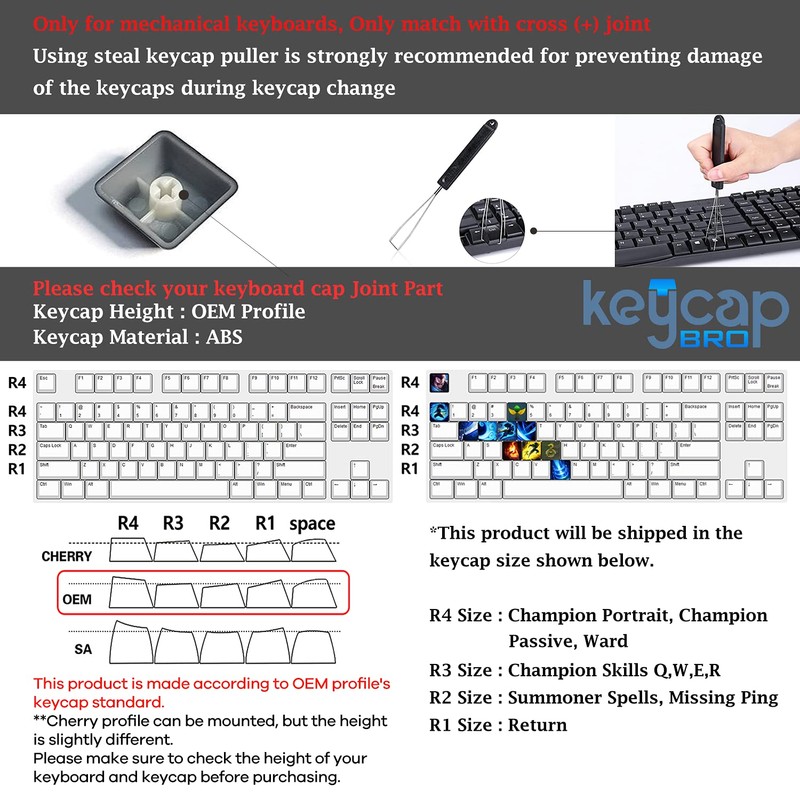- ⚡️ Keycap Size - R4: Champion Portrait, Passive, Ward / R3: Q, W, E, R Skills of each Champion / R2: All kinds of Summoner Spells, Missing Ping / R75: Return.