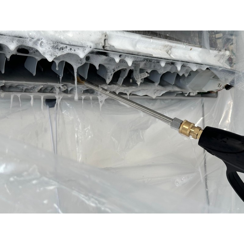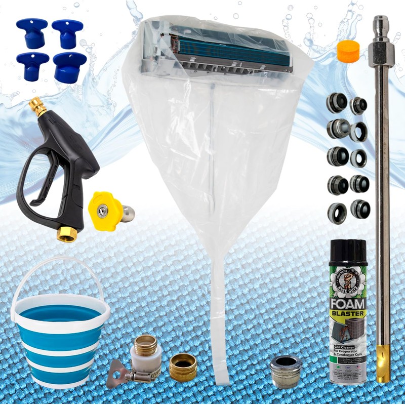 - COMPLETE MINI SPLIT COIL CLEANER SOLUTION - This kit has everything you need to deeply clean your ductless mini split air conditioner evaporator coil. Including a patented 360 coverage transparent mini split ac cleaning bag cover, Foam Blaster coil cleaner, Flow Tab drain treatment tablet, industrial duty spray gun, 9 angled spray wand, fan spray nozzle, collapsible bucket, and a 17-piece adapter to garden hose connection kit. Our expanding hose is sold separately.