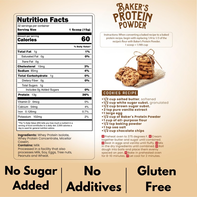- Clean and Unprocessed Lifestyle friendly - We believe in a clean lifestyle, which is why our Baker's Protein Powder contains no artificial sweeteners, no silicon dioxide, no soy, no gums, is gluten free, uses only 3 ingredients, and is free from fillers or additives, giving you full control of what ingredients you put into your body on your terms