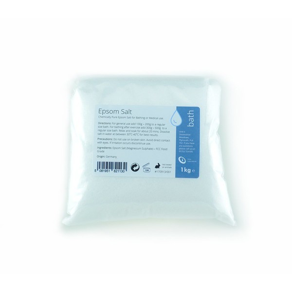 Product DescriptionHigh Quality FCC / BP Epsom Salt, which is perfect for bathing and soothing muscles. Bathing in Epsom Salts can improve your health in many ways: 1. Magnesium levels in your body increase - which is very important for a healthy body. 2. Sulphate levels in your body increase - which is good for detoxing you liver. 3. Reduces Stress Inducing Hormones - the relaxing ritual of a taking soothing relaxing bath while allowing Magnesium levels and antioxidant levels to increase reduces stress. For best results, add between 1-3 cups of Epsom Salt to your hot bath and allow to dissolve. What does BP & FCC mean? BP = British Pharmacopoeia, which means its been produced to the standard required to be ingested. FCC = United States Food Chemical Codex and now replaces most BP grades (FCC and BP are made to the same standards).IngredientsMagnesium SulphateDirectionsFor general use add 100g – 200g to a regular size bath. For bathing after exercise add 300g – 500g to a regular size bath. Relax and soak for about 20 mins. Dissolve salt in water at between 30oC-40oC for best results.Safety WarningAlways dissolve the salt in water before entering the bath. Avoid using hot water above 40°C to prevent skin irritation. Do not ingest the salt. After bathing, rinse the bathtub thoroughly to prevent slipping.