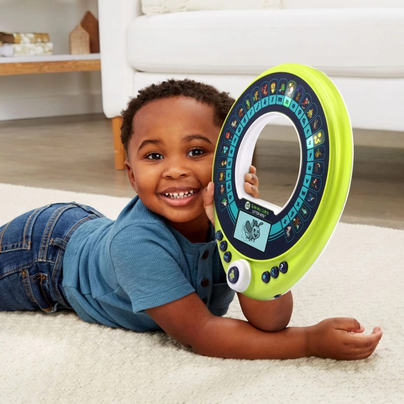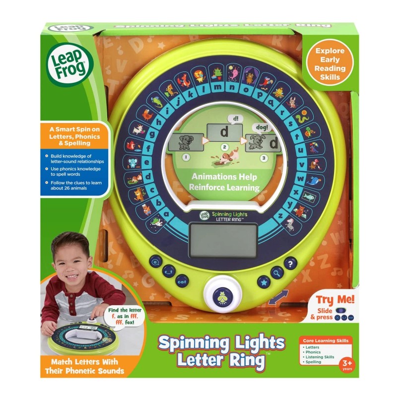 Meet Sparky the phonics firefly! Zip around the ring and this friendly little bug will light up each letter to introduce letters, letter sounds, spelling and animals. Delightful animations of Sparky and the animals accompany each discovery. Sparky loves to play hide and seek! Listen to the letter and letter sound clues to find the letters Sparky is hiding behind. Finding the firefly helps build early reading skills by getting preschoolers to look for Sparky again and again. Now that you know your phonics sounds, use what you’ve learned to build whole words with Sparky’s help. Well done! Get to know Sparky’s animal friends by listening to the clues. Find the animal Sparky’s hiding with on the ring by matching the animal to its description or the sound it makes. It is an alligator astronaut! Intended for ages 3+ years. Requires 2 AA batteries. Batteries included for demo purposes only. New batteries recommended for regular use.