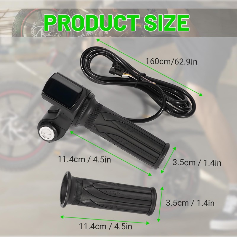 • 【WORKING PARAMETERS】Volt: 36V; Connector: 6 wires and 6-pin; Grip: Twist style; Cable Length: Including connector about 160cm (62.9inch); Material: Rubber grip + Plastic shell; Assembly: Not required; LCD Display: LCD display can clearly show remaining power and status of electric lock, and the high quality LED indicators make it easy to view at night, making your night driving safer and more reliable.