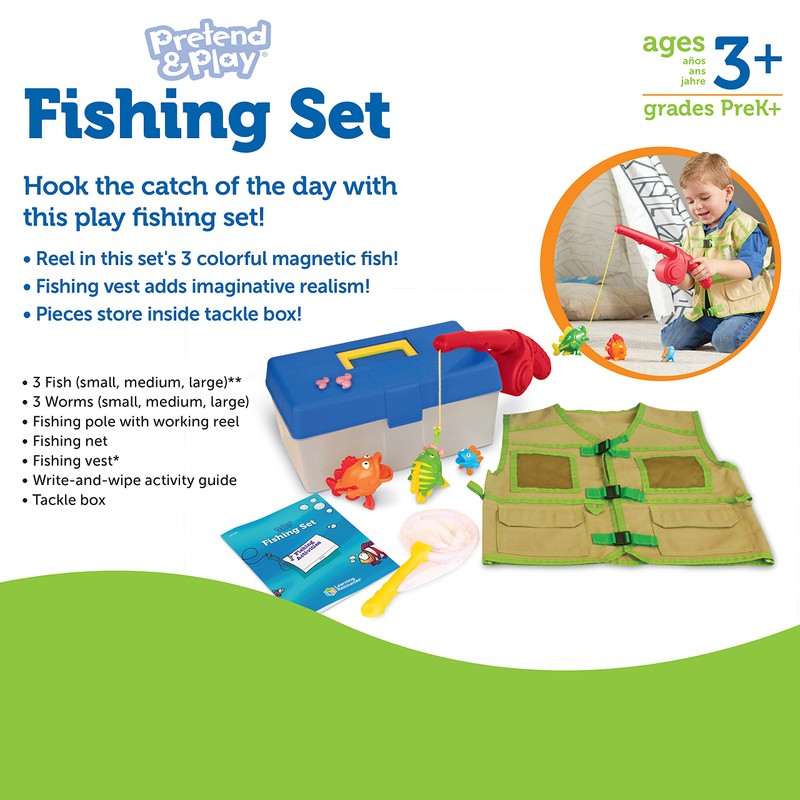 Reel in the big one. Little anglers can hook the catch of the day. Adjustable vest makes play even more realistic. Perfect for outdoor vacations and more. Play a size matching game with worms and fish. Features 6 pages of write and wipe, fishing-themed activities. Plastic pieces include pole with magnetic hook, 3 magnetic fish, 3 worms, net and vest (plastic, nylon and canvas). All magnets are embedded for safety. Plastic tackle box stores all pieces and measures 13"L x 7"W x 6"H. Ages 3 and above.